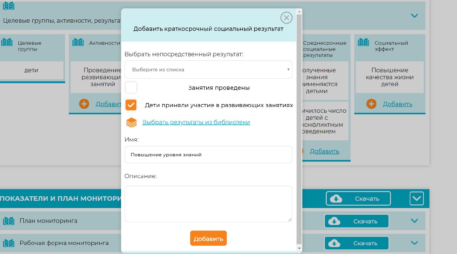 и показатели(Outcomes) - изменения, которые произошли благодаря реализации