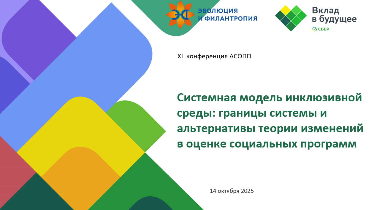 14 октября 2025 года на IX конференции АСОПП сессия ««Системная модель инклюзивной среды: границы системы и альтернативы теории изменений в оценке социальных программ» открыла трек «Инклюзия и оценка». Сессию вели директор программы «Инклюзивная среда» благотворительного фонда «Вклад в будущее» Инна Ширшова вместе с Ольгой Заводилкиной и Ольгой Евдокимовой. Команда представила совместно разработанный подход к системному анализу инклюзивной среды — как к динамической системе со множеством взаимных влияний, а не набору разрозненных практик.