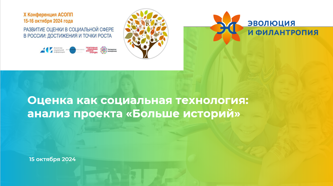 15 октября на X конференции АСОПП «Развитие оценки в социальной сфере в России: достижения и точки роста» прошла сессия «Оценка как социальная технология: анализ проекта «Больше историй»». Ведущие — Т. Арчакова ( АНО «Дирижабль») и О.Евдокимова (АНО «Эволюция и Филантропия»).